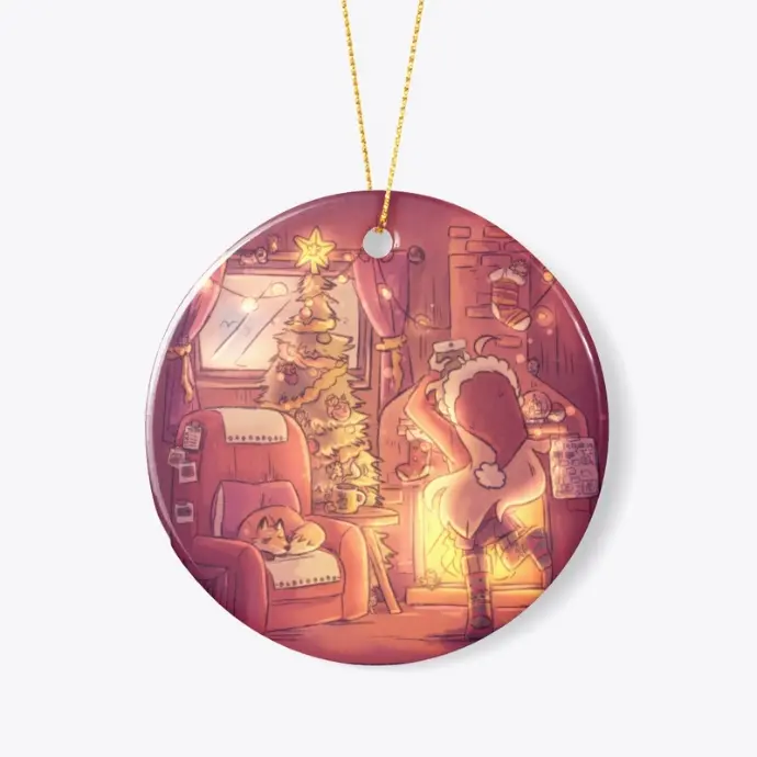 Pendant qu’elle ajuste une décoration, Renard s'est endormi dans le fauteuil et profite de la sérénité du moment. Les guirlandes scintillent, les chaussettes sont accrochées, et tout semble prêt pour passer de merveilleuses fêtes !