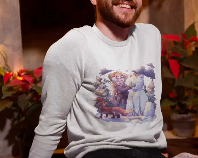 À ses côtés, Renard déguisé en renne la suit fièrement : écharpe rouge, petites cornes, et beaucoup d’enthousiasme ! Sa présence apporte une touche d’humour et de tendresse qui fait sourire Flannou à chaque pas.